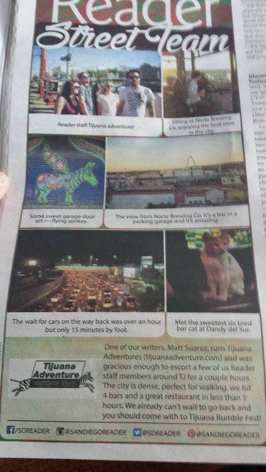 I was supposed to have a beer tour on Saturday, but it ended up getting canceled. The San Diego Reader not only announced my tours, but it also got printed in the magazine. This is my chance to make TijuanaAdvenrture grow and to further my career as a writer.