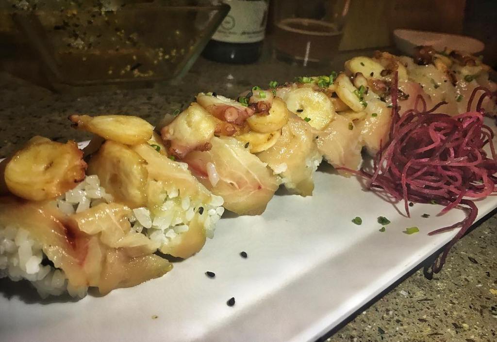 My girlfriend got the kraken roll. Yellowtail, breaded surimi, topped with octopus and herbs. This was the best one. But it was also not really sushi.