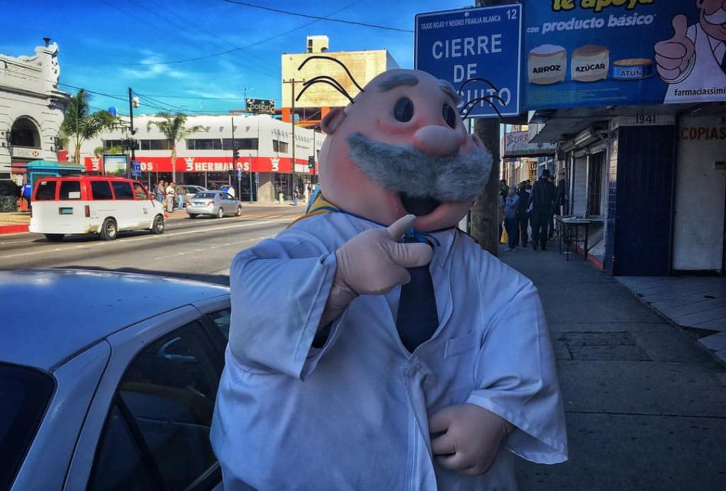 Patricio says he washes the costume daily before work. Under the policy of Farmacias Similares, the Dr. Simi outfit belongs to the employer after one year of work. Patricio burns his costume at the end of every year.