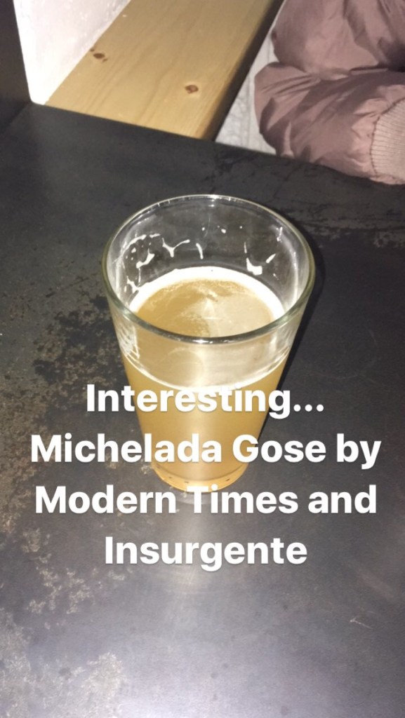 My girlfriend and I started at Insurgente. I got her the coffee IPA (Sospesso IPA), and I got a new beer, a collaboration between Insurgente and Modern Times named “Utopian Cities.” It’s a Michelada Gose style beer. It has barely any Michelada flavor, but it’s rich in Gosiness. It’s not that salty, and it leans towards sour power. It’s very good for sour lovers. If not, then stay away.