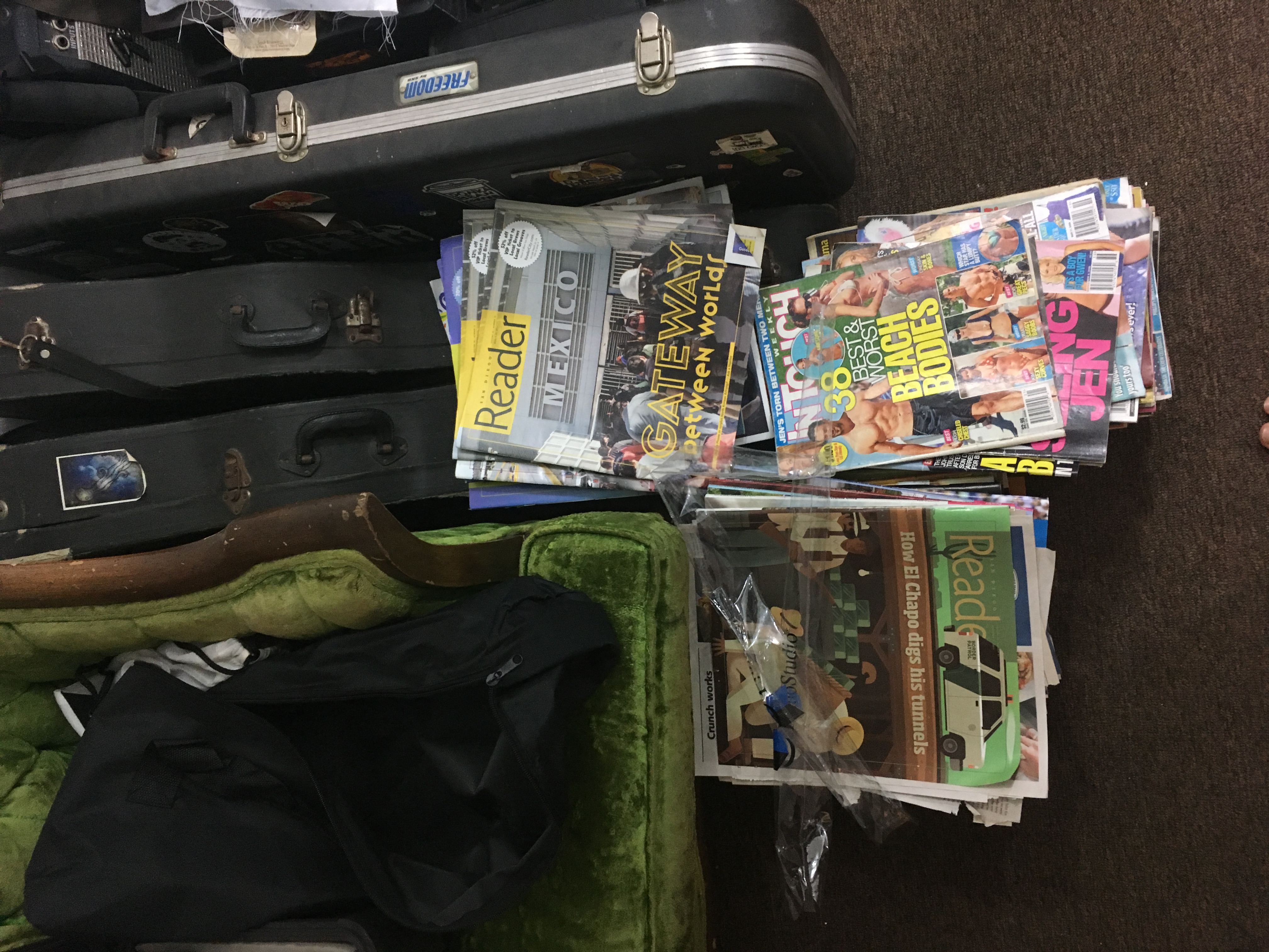 I also moved the stack of magazines to the side of the couch. Huge stack of magazines. Many from years ago from my paparazzi days and a lot from the San Diego Reader. The idea is to throw them away after clipping away my articles and pictures. Make a nice big folder with my track record of almost a decade in magazines.