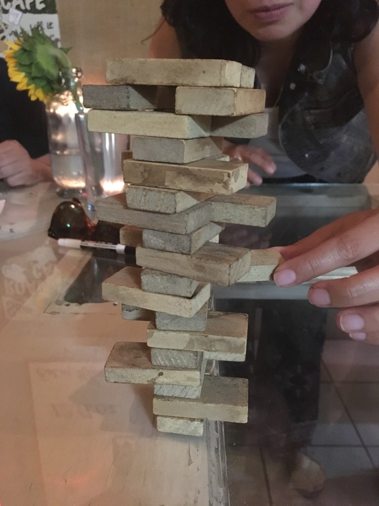 It was Pinche Paco’s birthday. We met him there. We played a round of dominoes. I made a domino Jenga. It was silly.