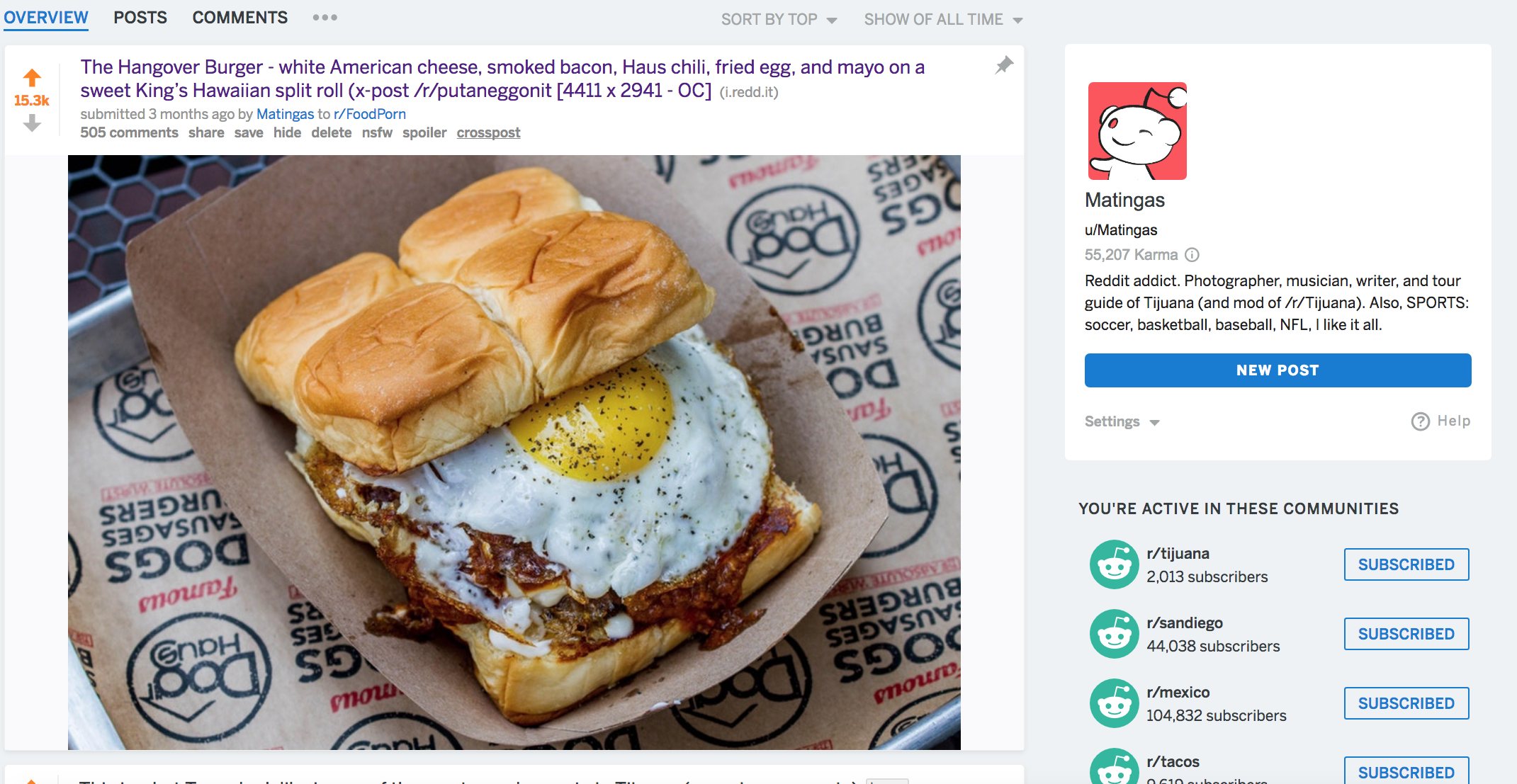 I forgot that top post was that burger. Dog Haus should pay me for that picture. It has 192.4k views. That’s a lot of fucking views. 15,336 karma points come from this post (89% upvoted). So some fuckers still saw this picture and downvoted.