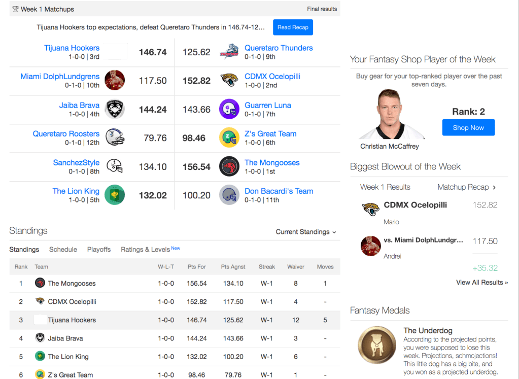 El mega veterano contra Mario robot y gana el robot. El veterano se fue por los novatos y por un QB de los Browns prometedor que no cumplió para nada (toda esa ofensa fue una decepción). Y el bot… pss el bot sabe lo que hace. Tiene a Mahomes. Tiene a Tyreek Hill (que se lesiono pero es una bestia). Tiene a Amari Cooper y al millionario de Zeke Elliott. Carson le hizo un putero de puntos que no entiendo por que lo suelta por un Felipe Ríos teniendo a Mahomes y a Winston (que la cago mucho, pero TB va mandar pases toda la temporada). Y su banca esta bien bonita también. Mariobot tiene de los mejore equipos de la temporada gracias al autodraft y un Elliott que nadie quizo tocar por sus dramas pero se lo quedo el y vaya vaya vaya. También tiene muy buena banca… El Pelón veterano tiene que hacer muchos ajustes para la siguiente semana mientras que el bot tiene que dejar todo en automático para poder perfirlarse a los playoffs.