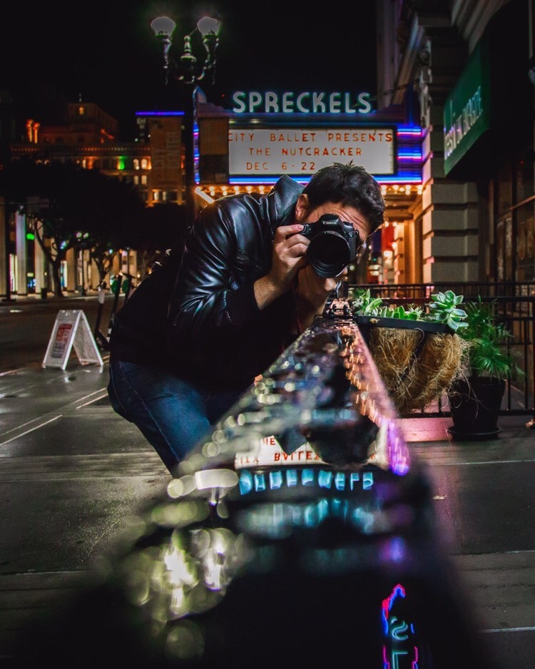 He had this idea that he stole from another photographer of a picture of a railing by Spreckles theater reflecting the rain.